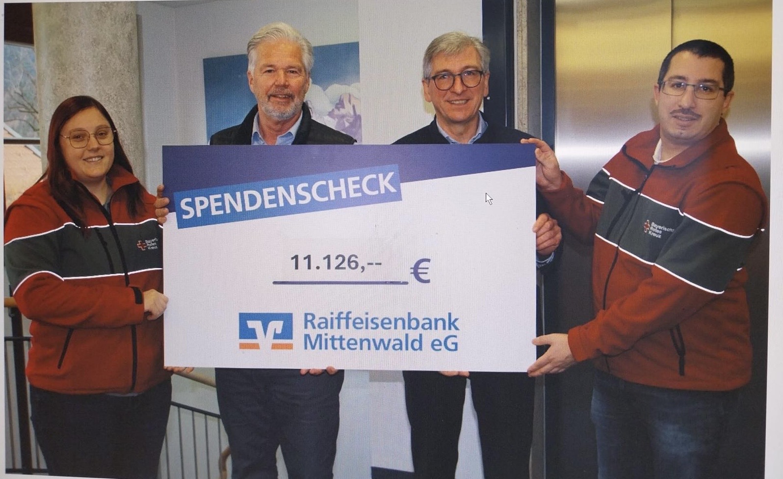 Am 22.12.2025 konnten wir einen Scheck über 11.126 Euro zur Beschaffung eines neuen Beatmungsgerätes an die BRK Bereitschaft Mittenwald übergeben